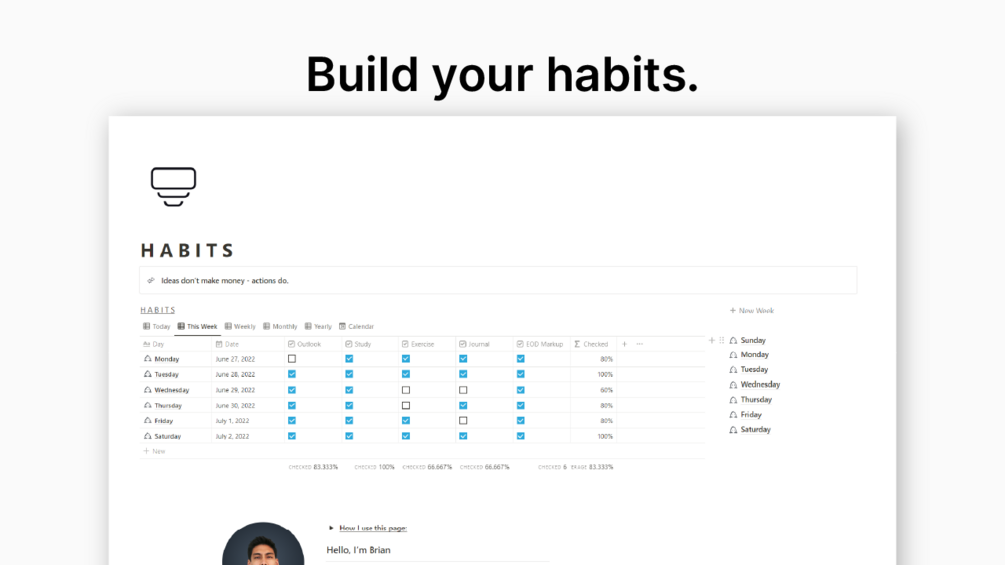 We are creatures of habit. We are what we repeat. Use this Habit Builder to help you build long lasting, positive habits. Habits will make or break you. This Notion template will help make you.