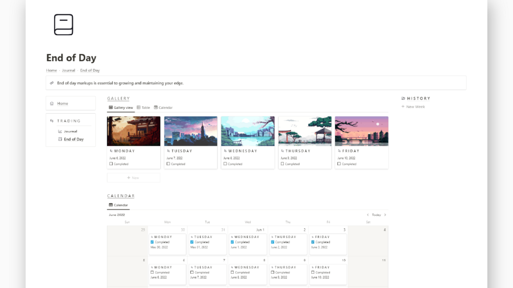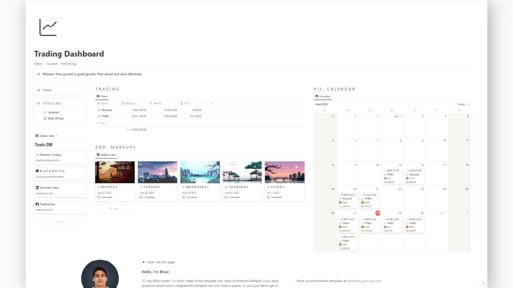 Queue Notion. This all-in-one trading dashboard makes it easy to track all of your trades and markups. You can see your account balance, net p/l, easily add new trades, track progress for the week, month or year and view your performance at a glance using the p/l calendar. Not only can you track your live trading but you can also track your backtesting sessions and view historical data with ease.